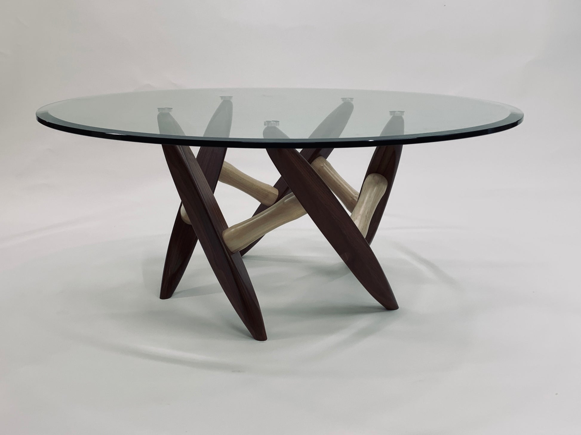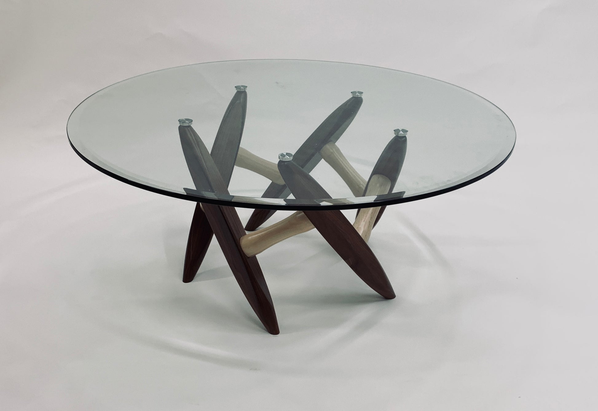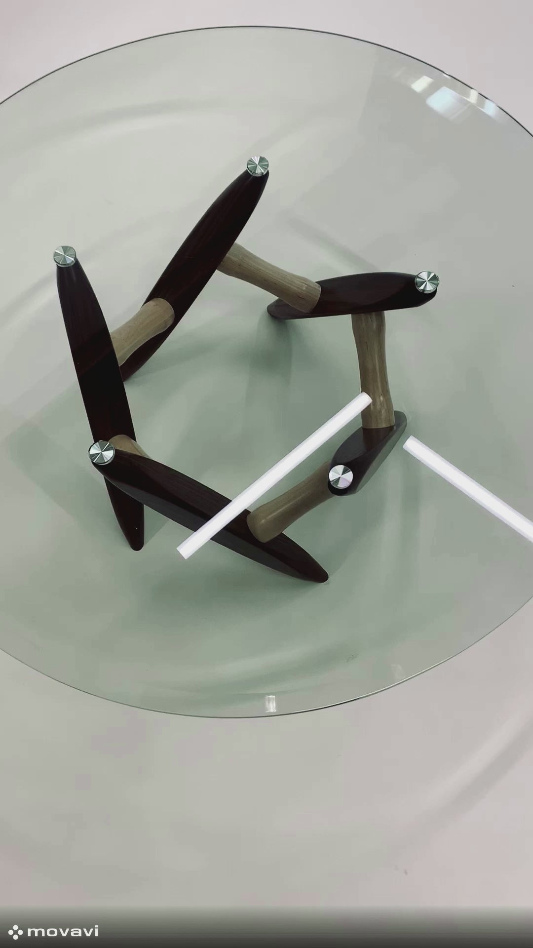 The Chiral K531-40, like the T531-44, builds on the ideas of the earlier T351 series. It is a glass-top coffee table on a sculptural solid-wood base of five legs leaning into, and past, each other. Each leg has a triangular cross-section and tapers at the ends.