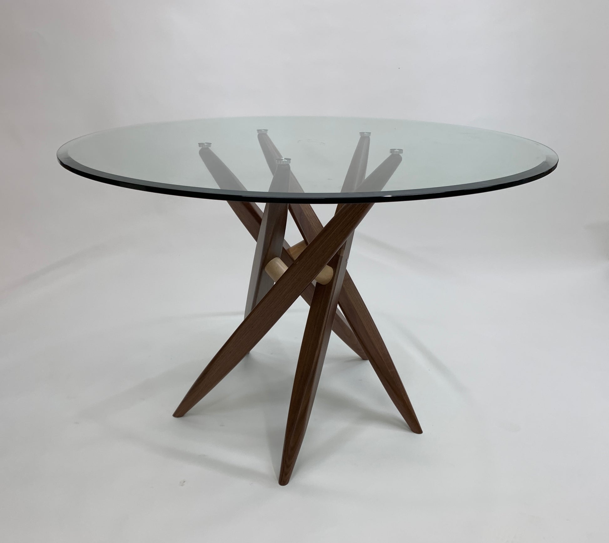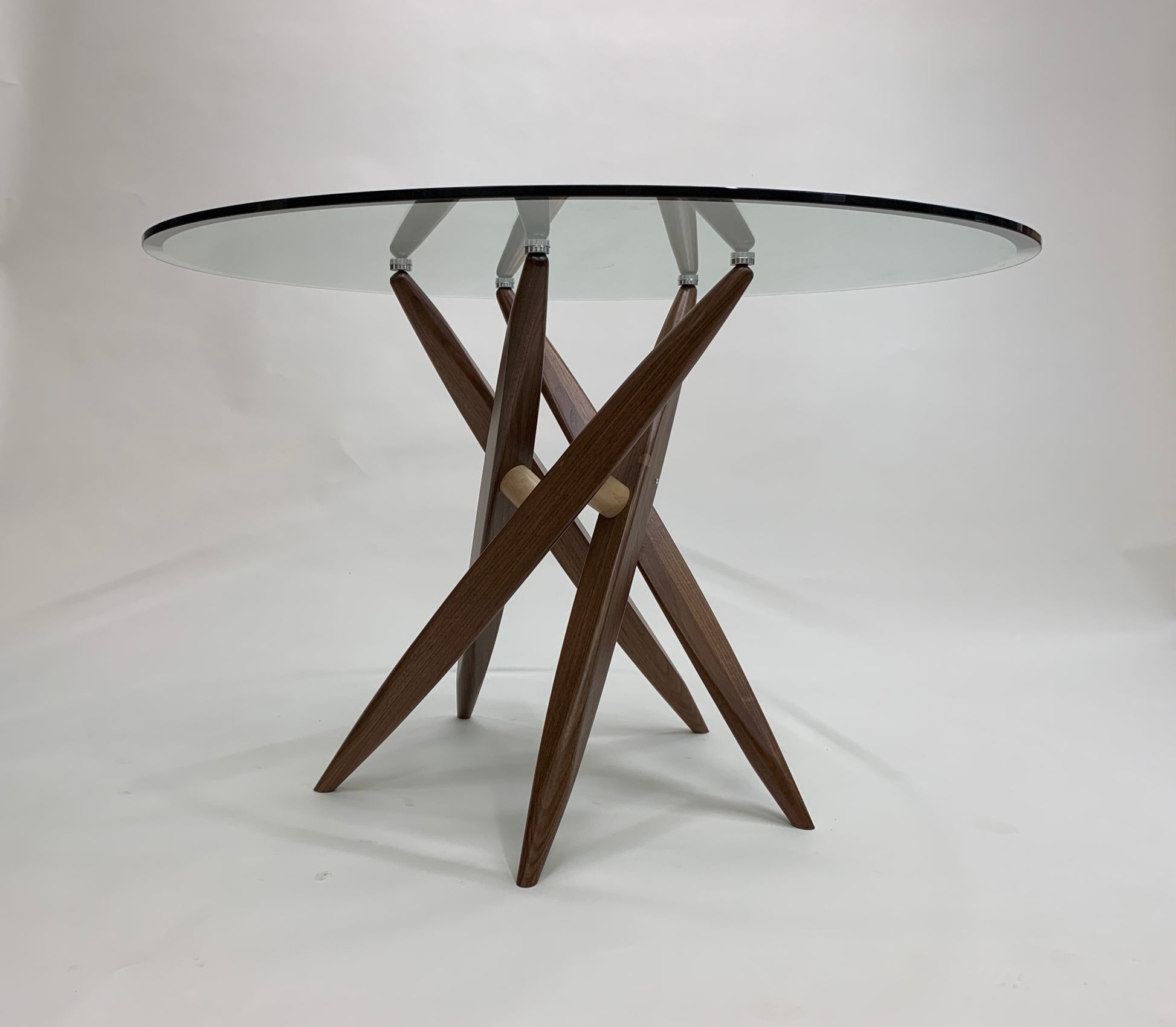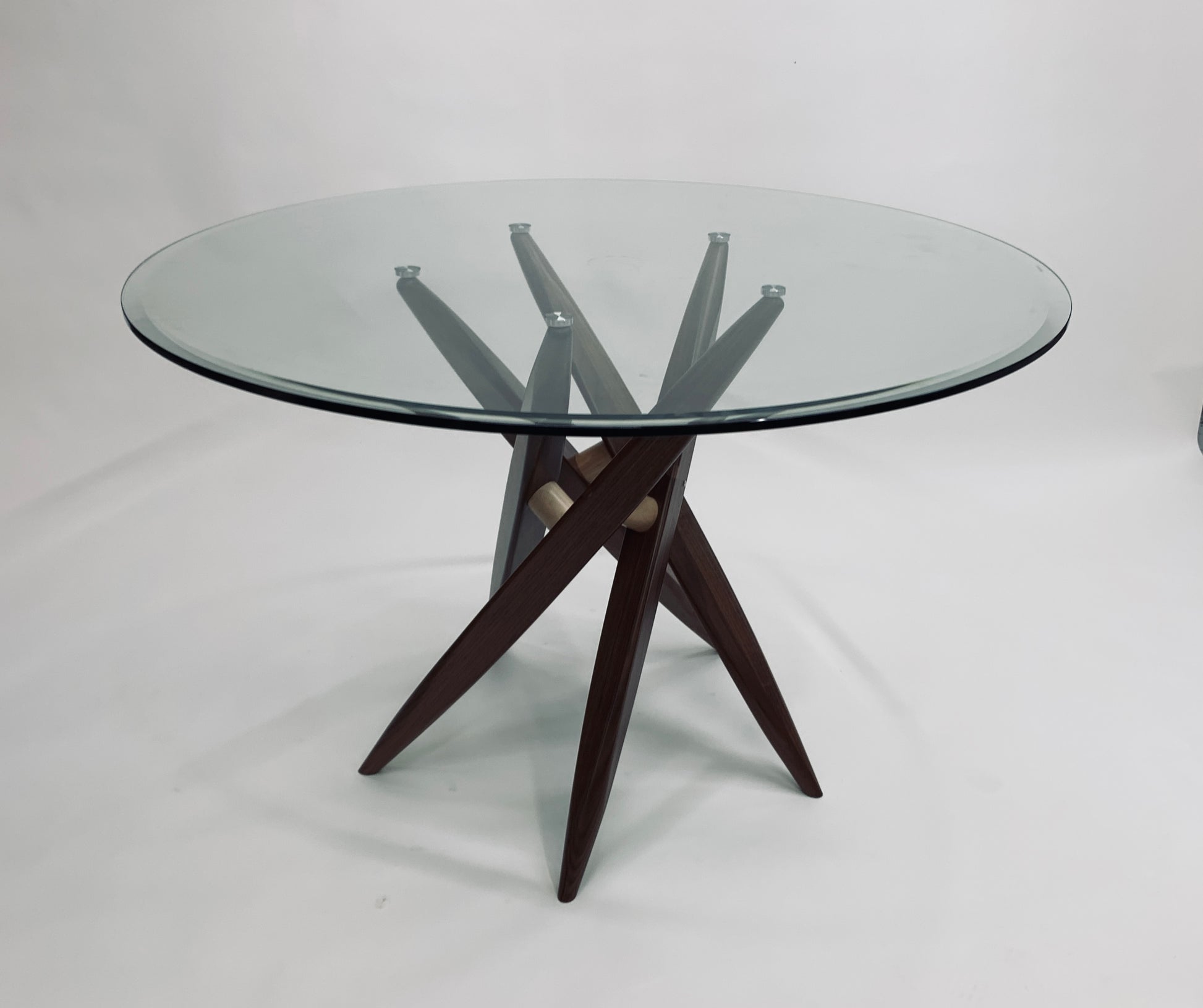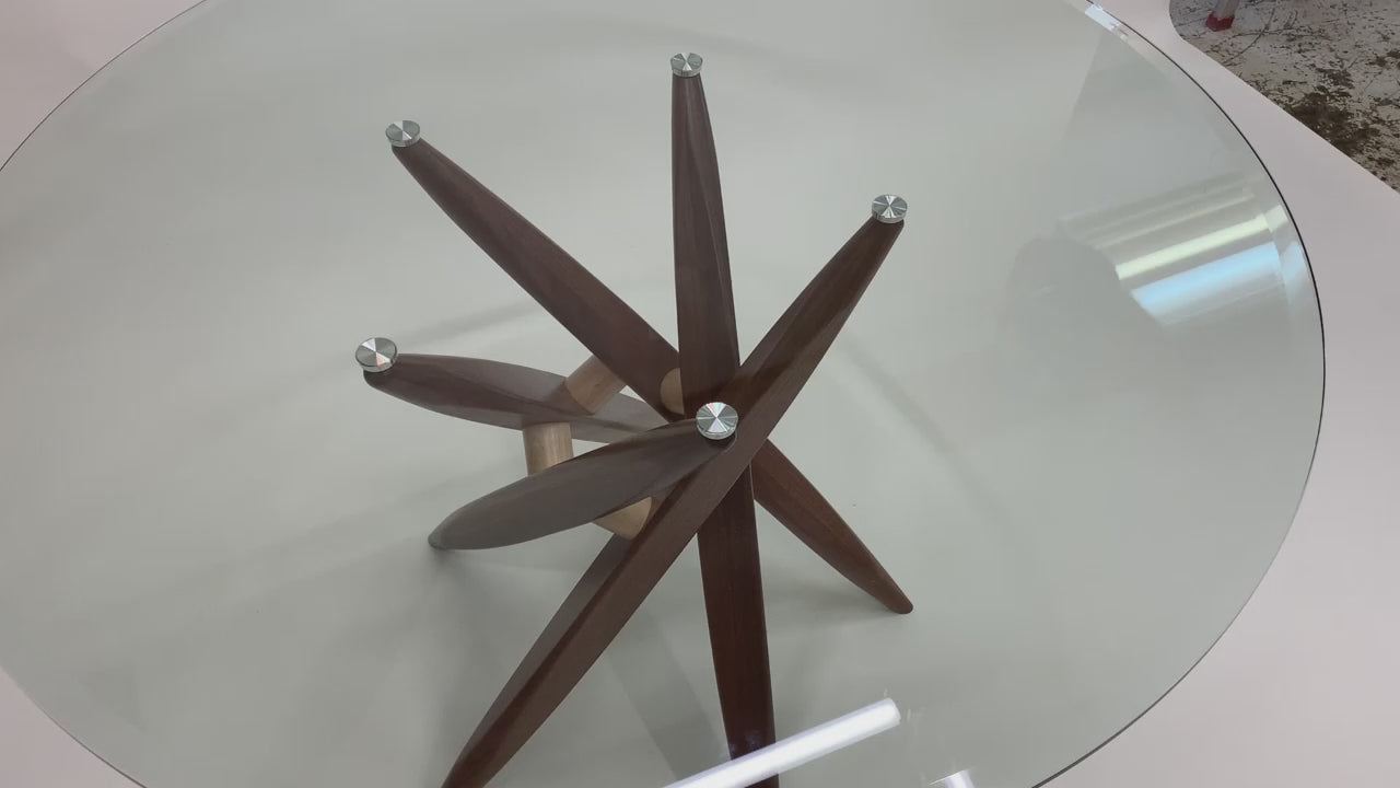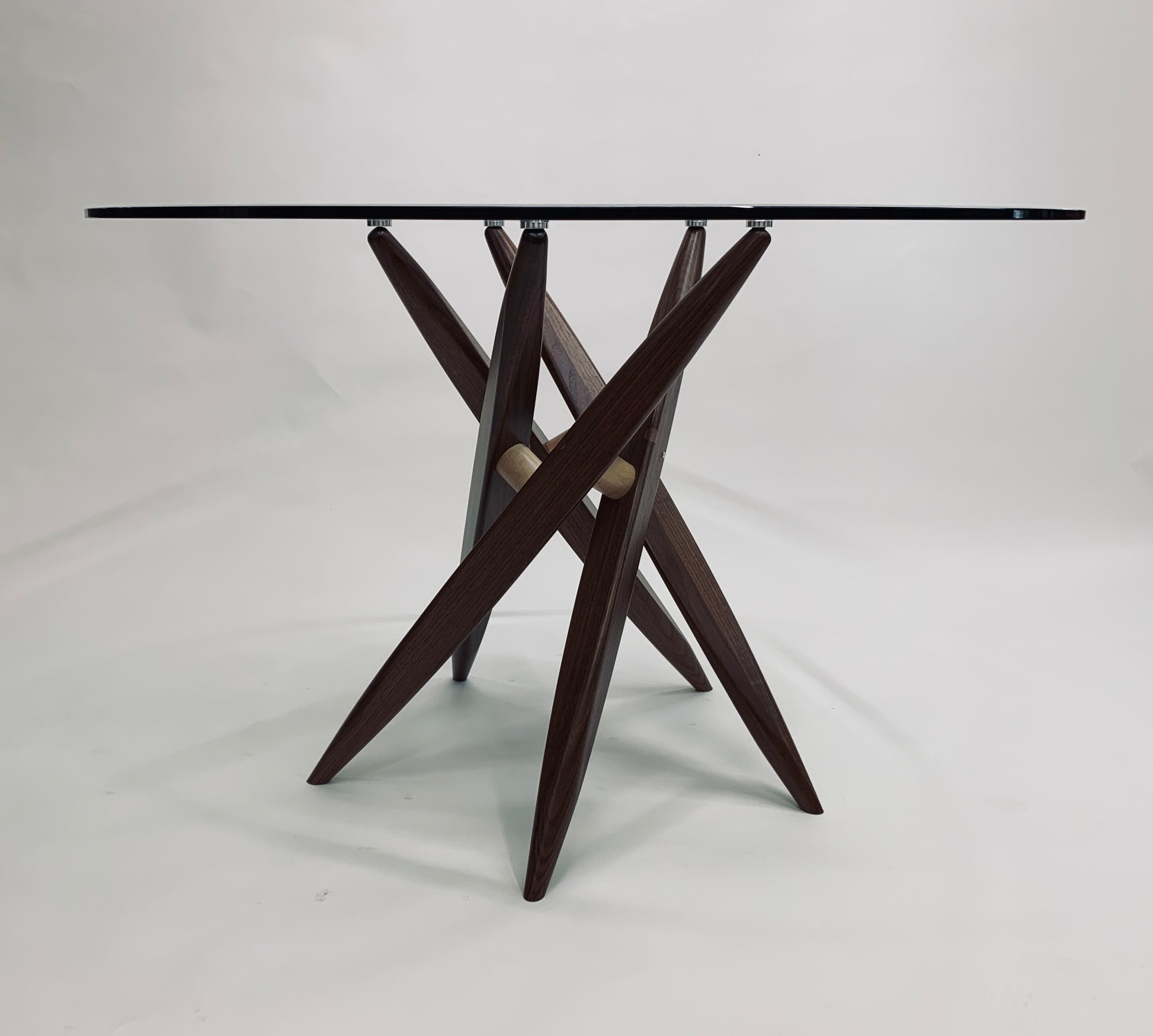 The Chiral T531-44 builds on the ideas of the earlier T351. It is a glass-top table on a sculptural solid-wood base of five legs leaning into, and past, each other. Each leg has a triangular cross-section and tapers at the ends.