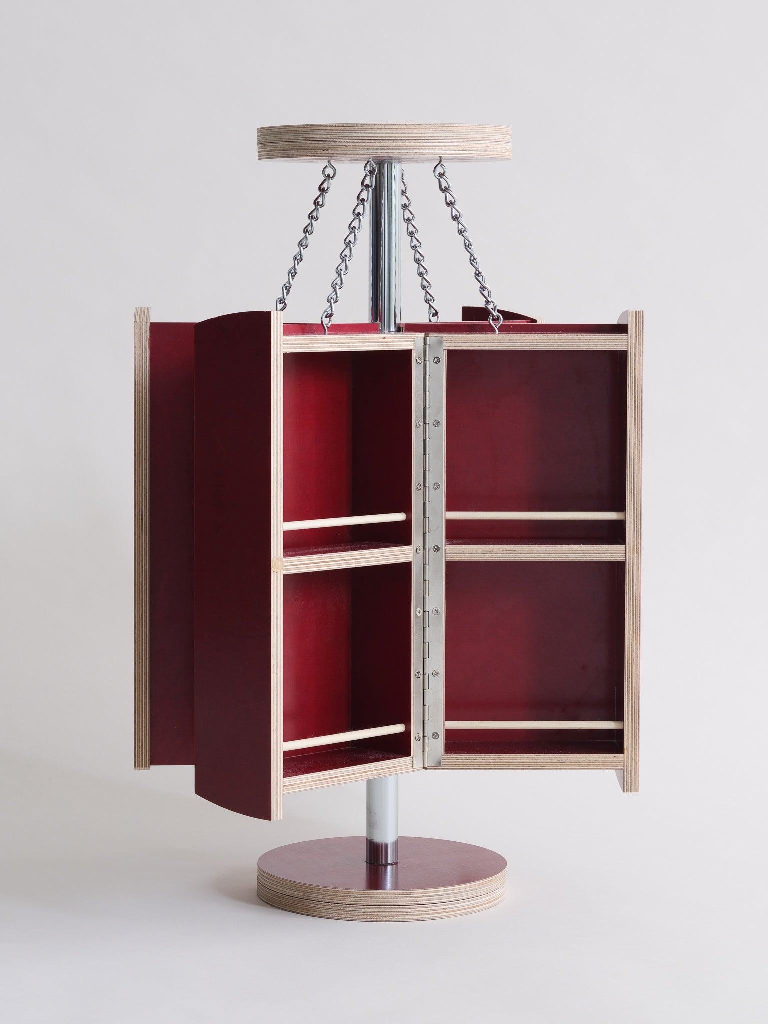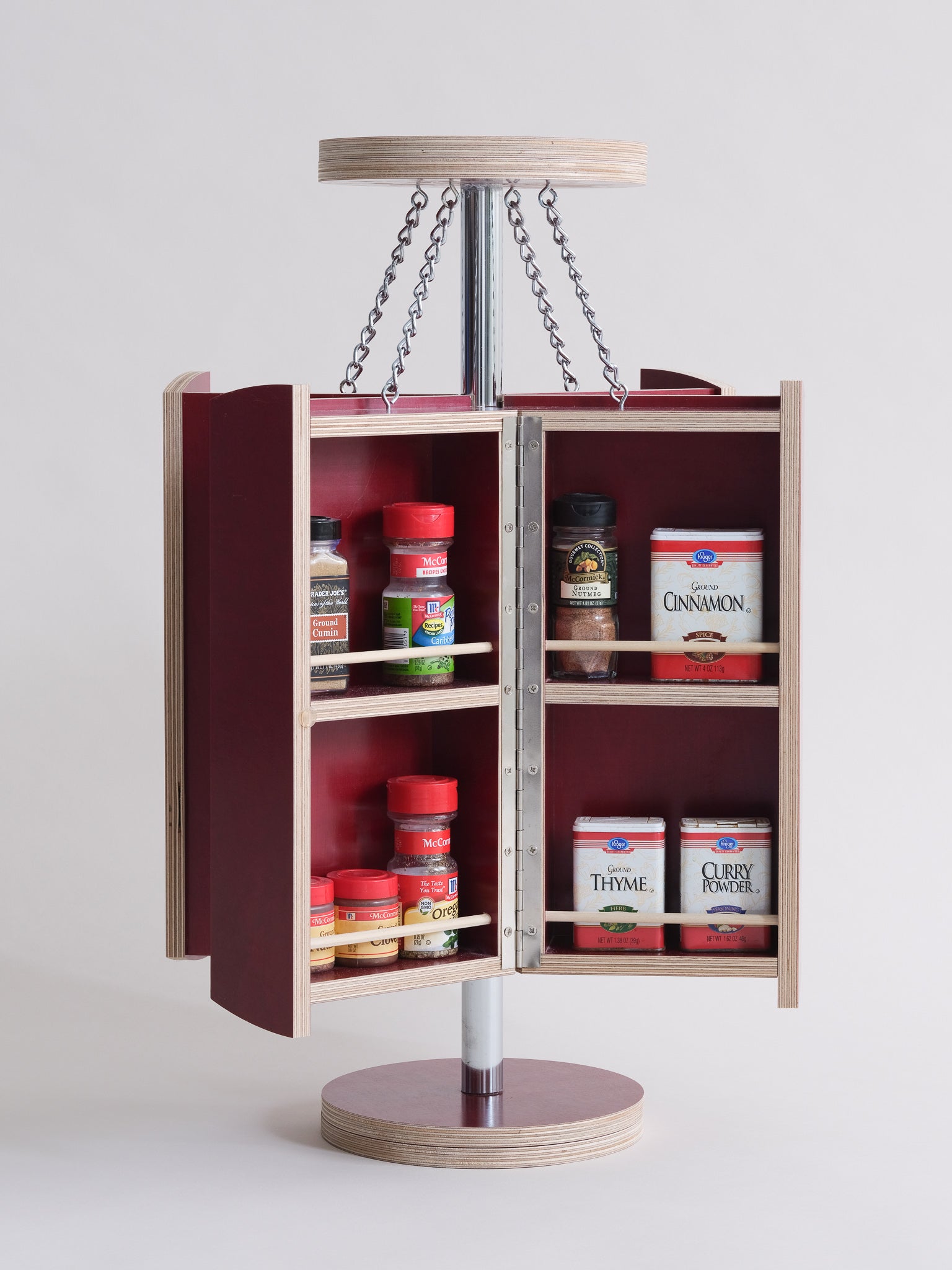 Piro Spice is a sculptural object that doubles as a countertop spice cabinet. The design, backed by a utility patent, allows the cook to access his or her spices easily, flipping open the cabinet and spinning, as needed. The bulk of the material is a pre-finished high-grade Baltic birch multiply that is intended to withstand rough handling (although you can also be gentle with it!).