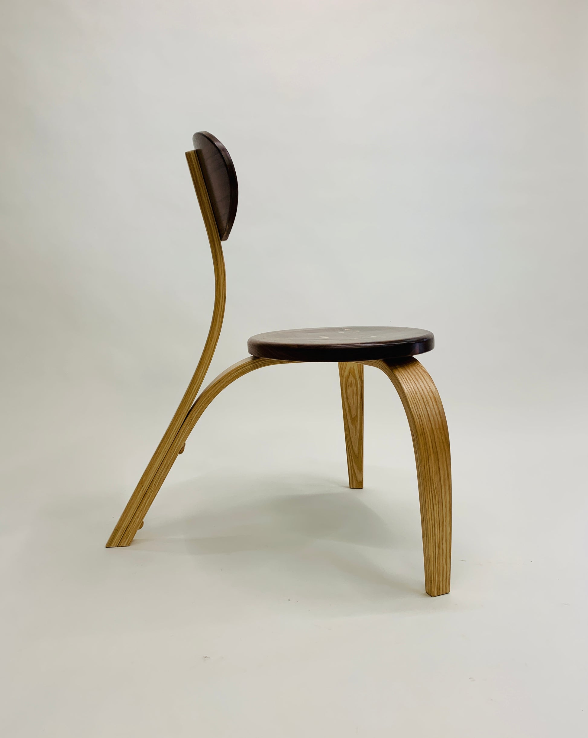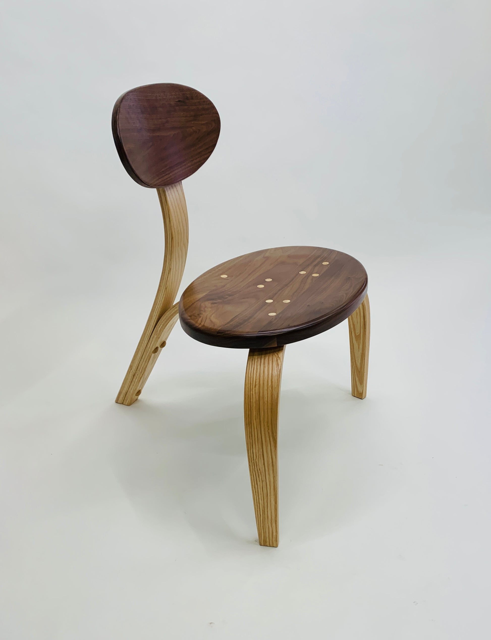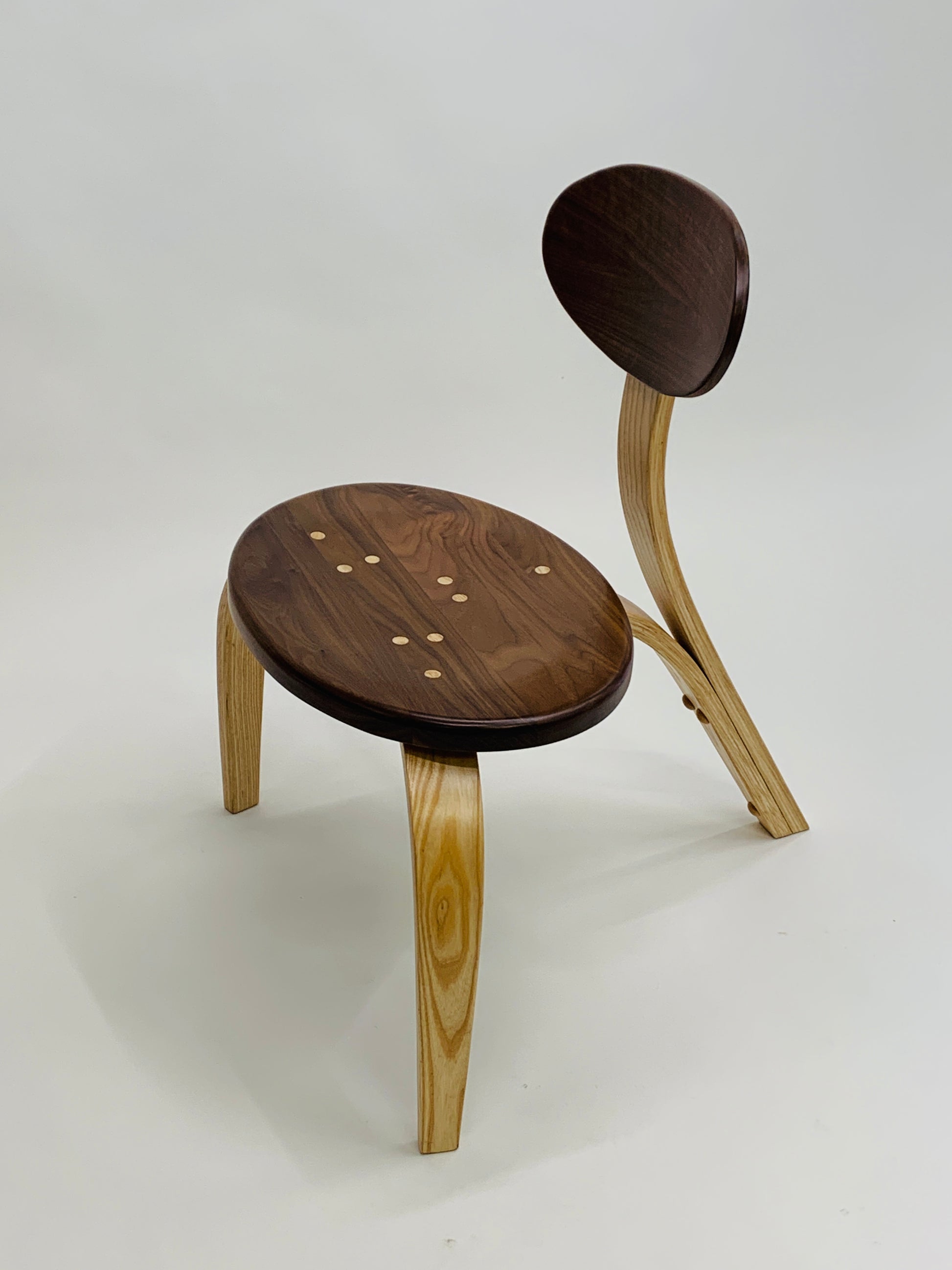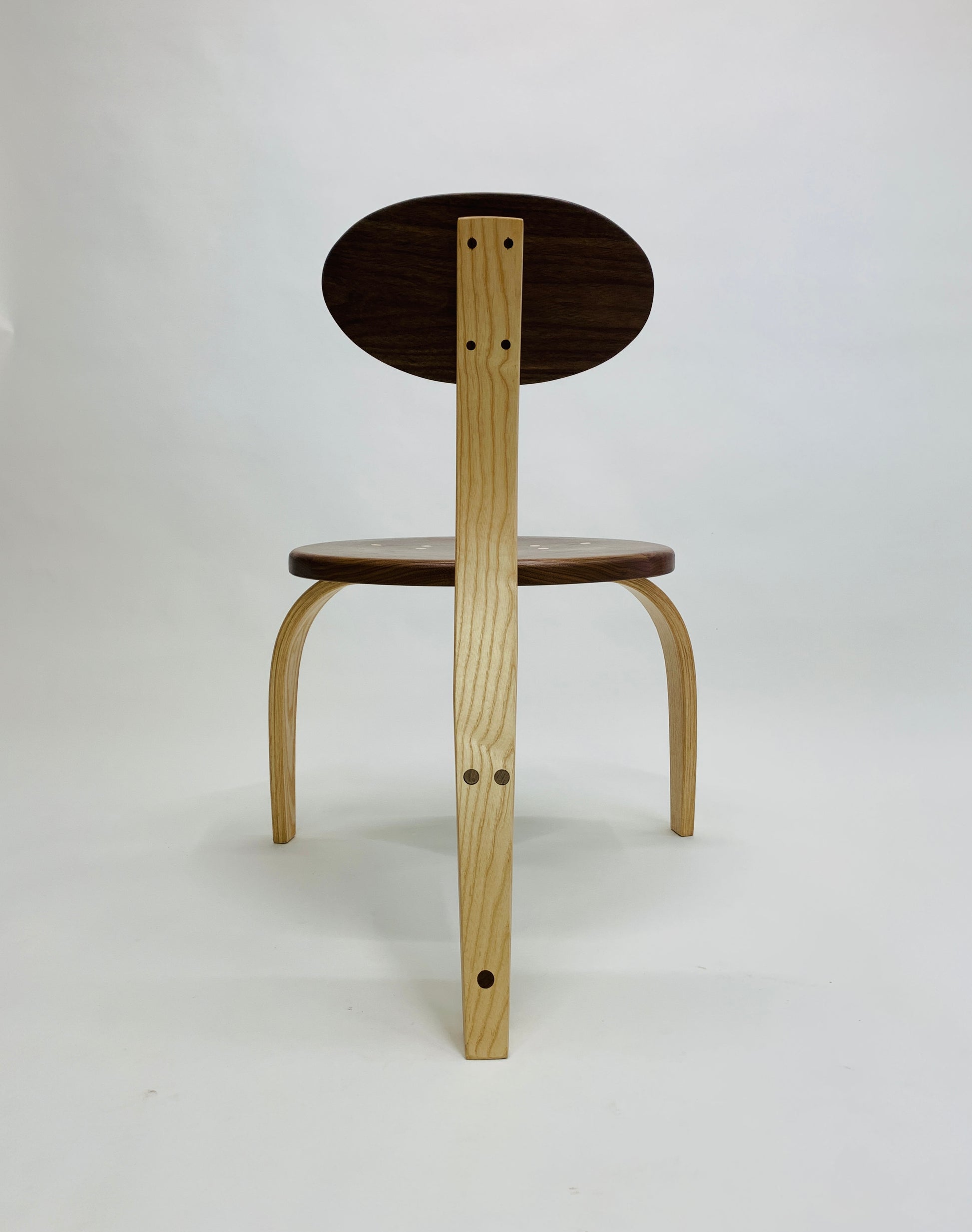 The two woods used are walnut and ash. The curved pieces are real wood, the result of an industrial process that involves lamination and glue. For both the table and the chairs, the main joinery is literally nuts and bolts, with bolt heads recessed and concealed under wooden plugs which I've chosen to accentuate with contrasting wood.