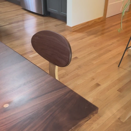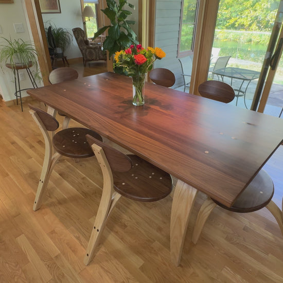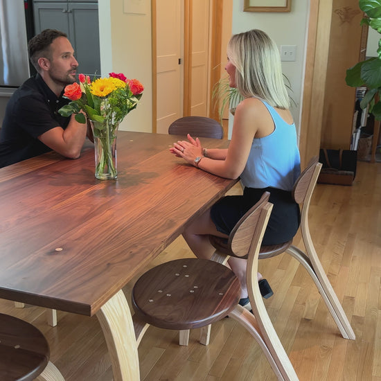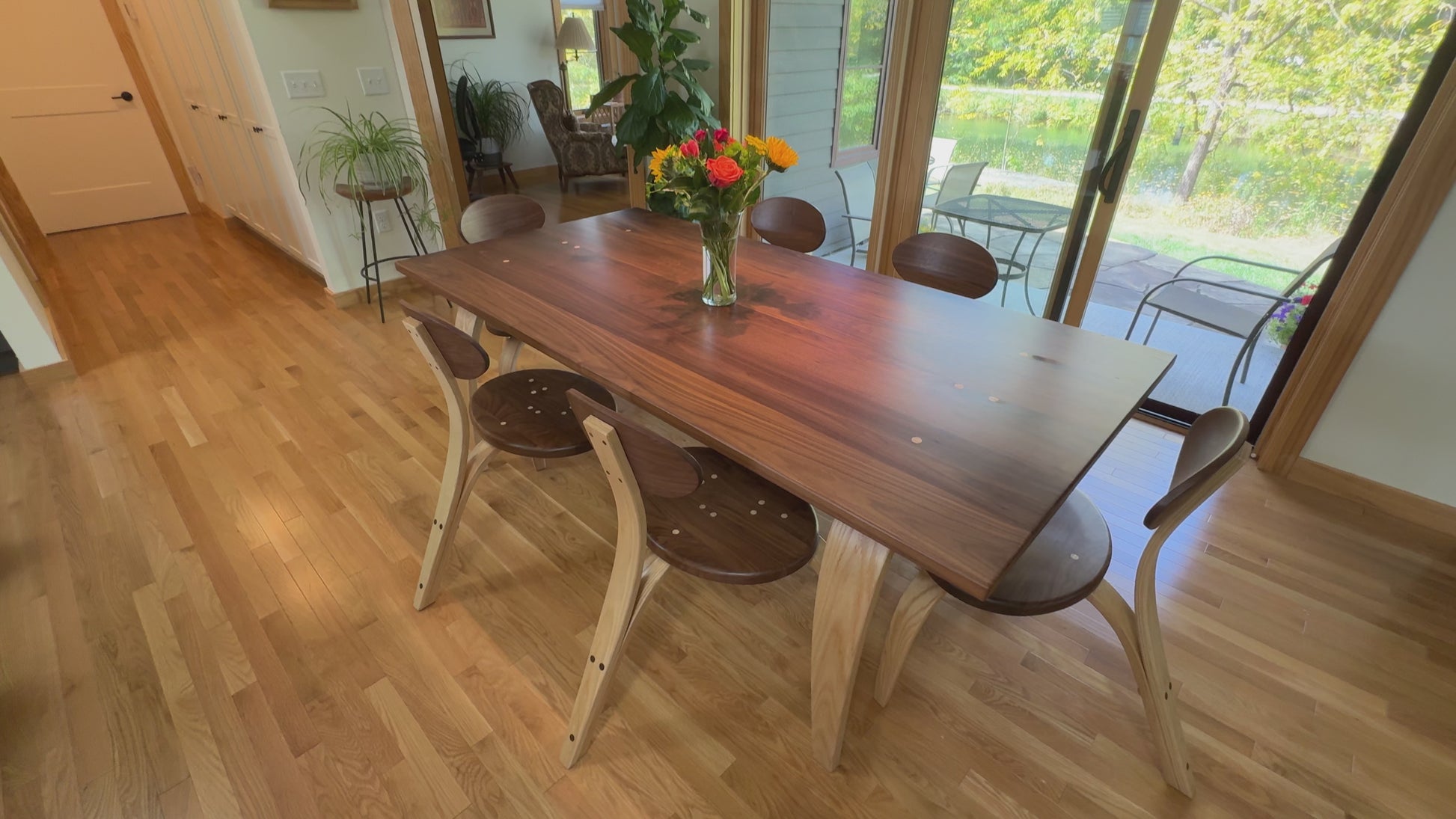 After I designed the Jetsons Dining Chair I knew it needed a dining table to go with it. So, voila', a table with a two-tone look, minimal, curving legs, and joinery that uses nuts and bolts. The table's dimensions are such that the six chairs fit comfortably.